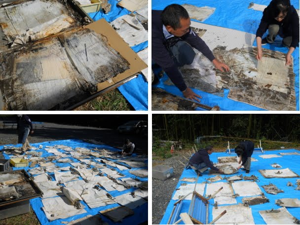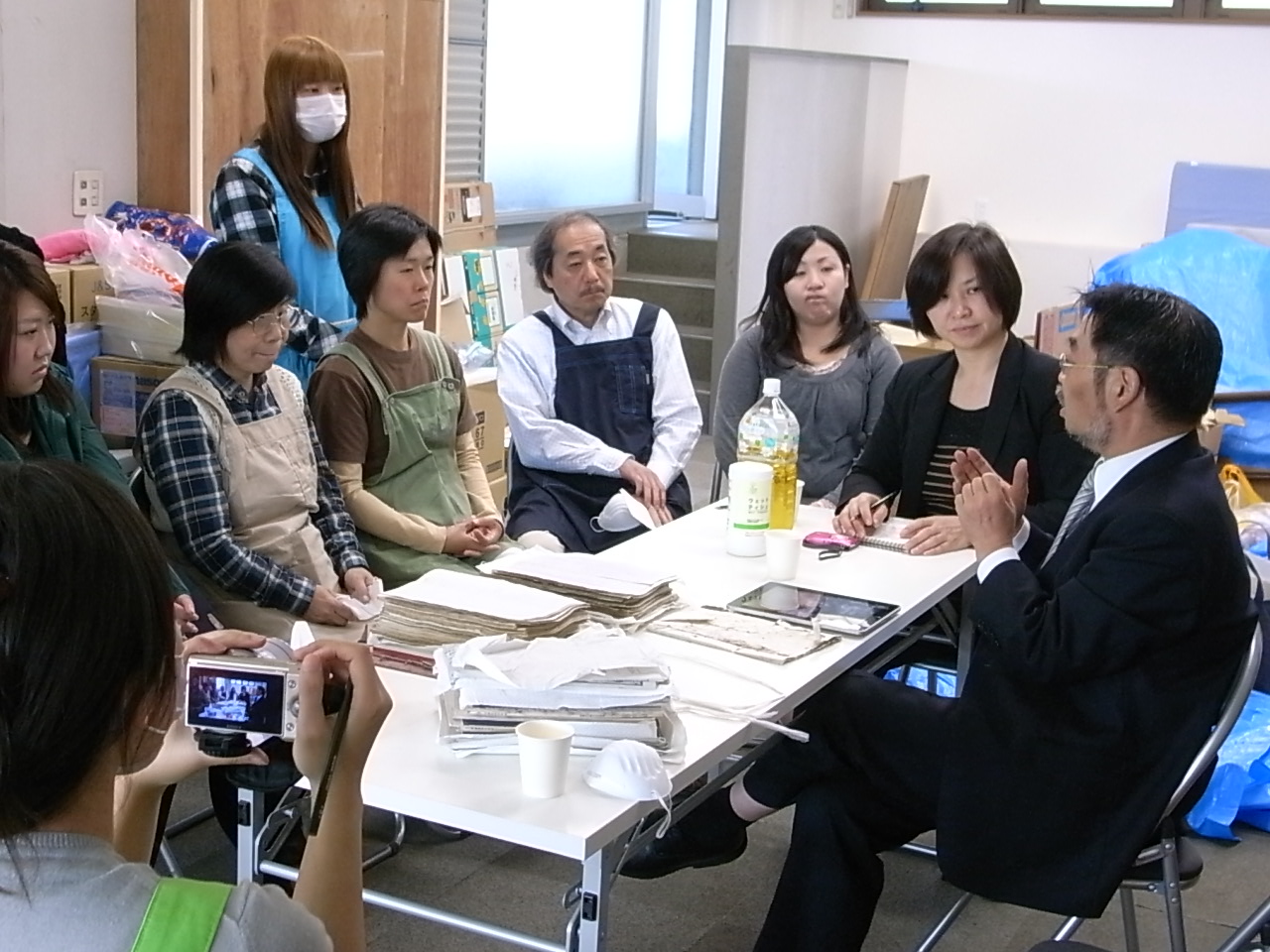 また16日には法政大学と陸前高田市議会との間で結ばれた包括的な連携協力のための協定締結のために訪れた伊藤明彦・市議会議長らの一行が現場を訪れ、復旧事業の説明とともに、作業スタッフが行なっているドライ・クリーニング、洗浄、乾燥・フラットニングという一連の作業を見学しました。