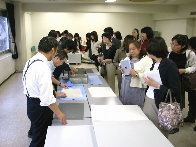 10月14日に開催された全国図書館大会第11分科会「災害と資料保存」において、「被災資料を復旧する--東京文書救援隊の考え方と技術」の講演を行いました。講演後のワークショップでは、文書復旧システムを参加者に体験してもいました。実体験の希望者が多く、活気のある会になりました。
