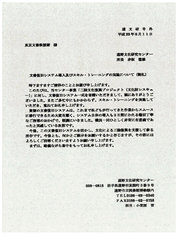 遠野文化研究センターへの東文救文書復旧システム導入報告