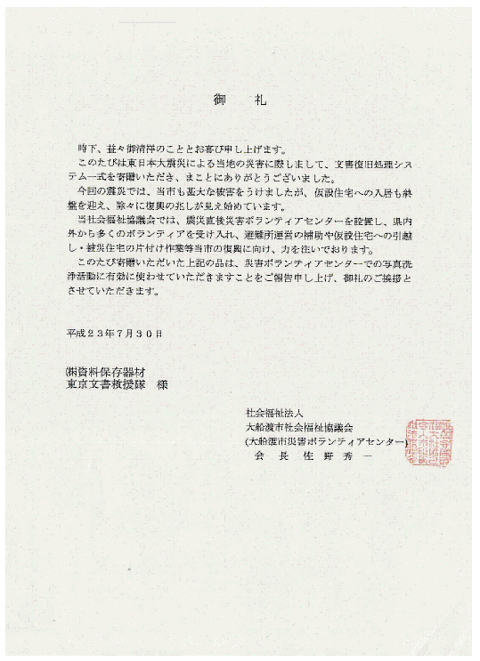 群馬県立文書館で行っている被災文書救助活動は9月中に終了し、女川町に返還される予定。期日の関係から、全ての資料を洗浄することは断念し、表紙や特に汚れの酷い資料にのみ適用することになりました。ただし、今後洗浄を行う必要が生じた場合に備え、女川町へ資料を返還する際、東文救の文書復旧システムも引き継ぎたいとのことです。