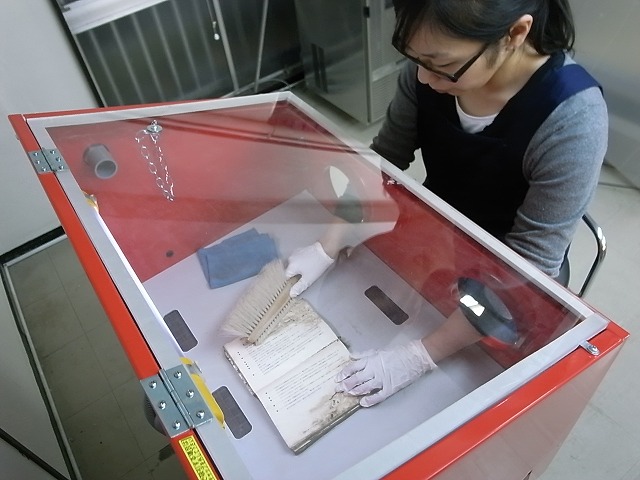 東京文書救援隊はこのほど、カビや汚泥に見舞われた簿冊や書籍のドライクリーニングに適した新しいドライクリーニング・ボックスを開発しました。これまでの紙製(中性コルゲートボード)のドライクリーニング・ボックスは、簿冊等を解体した一枚もの用のドライクリーニング作業に適したボックスとして開発されたものですが、今回の新型は解体を前提とせず、簿冊や書籍をまるごと掃除するためのものです。特にひどいカビや汚れが付着した簿冊等のドライクリーニングに適しています。もちろん、一枚もののクリーニングにも、従来型ほどには資料のハンドリングは簡易ではありませんが(アクリル透明上蓋を開閉して資料を出し入れするため)、問題なく適用できます。