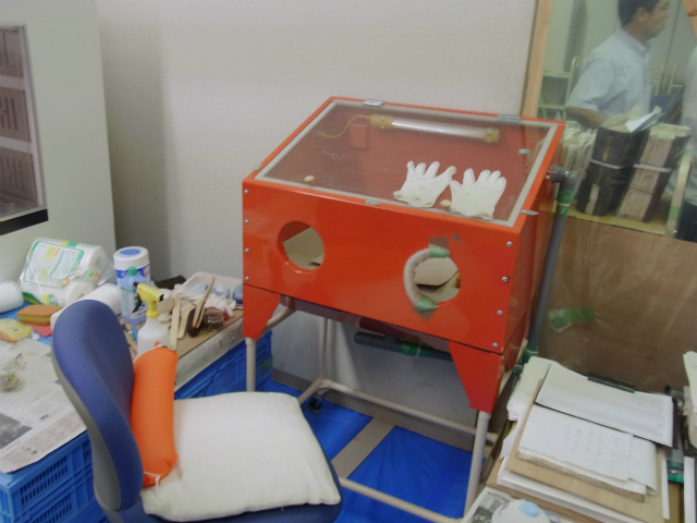 東文救システムの設営とスキル・トレーニングには、白岩氏とともに東文救から2名のスタッフを派遣し、ドライクリーニング、洗浄、乾燥方法を実演しました。写真修復の専門家である白岩氏は、被害の酷い写真や処置の判断に迷うものへアドバイスし、洗浄処置などをボランティアの方々と一緒に行いました。また、被災写真の洗浄にフローティングボード法、乾燥・フラットニングにエア・ストリーム乾燥法を適用した処置を実演しました。ボランティアの方々からは、これまで以上に効率よく洗浄と乾燥作業が進むとの評価をいただきました。