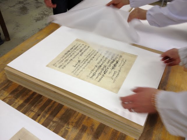賞状はすでにボランティアの方々によりドライクリーニングが終了していたため、復旧システムの洗浄と、その後の乾燥・フラットニングを主に行なった。