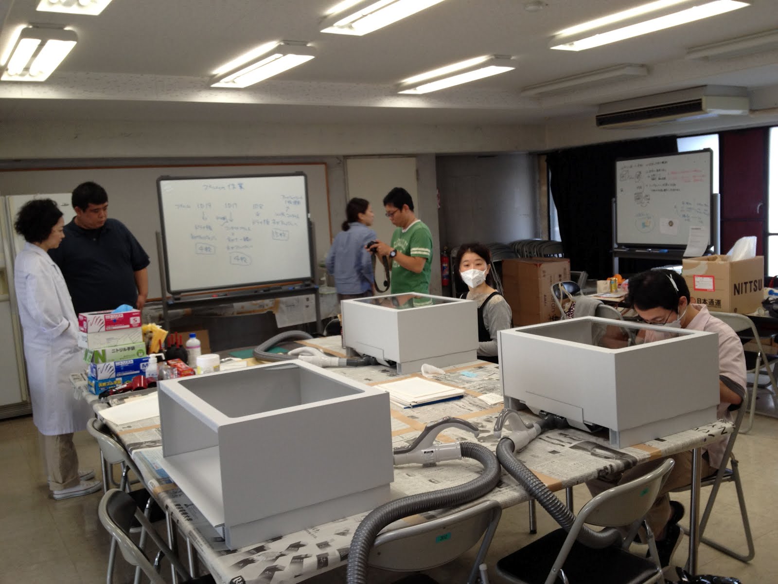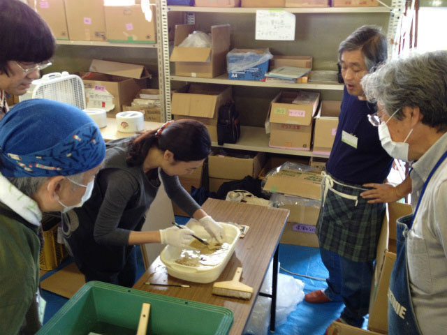 東文救システムの設営とスキル・トレーニングには、白岩氏とともに東文救から2名のスタッフを派遣し、ドライクリーニング、洗浄、乾燥方法を実演しました。写真修復の専門家である白岩氏は、被害の酷い写真や処置の判断に迷うものへアドバイスし、洗浄処置などをボランティアの方々と一緒に行いました。また、被災写真の洗浄にフローティングボード法、乾燥・フラットニングにエア・ストリーム乾燥法を適用した処置を実演しました。ボランティアの方々からは、これまで以上に効率よく洗浄と乾燥作業が進むとの評価をいただきました。
