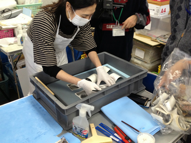 当日の東文救システムの設営とスキル・トレーニングには、白岩氏とともに東文救から2名のスタッフを派遣しました。また、写真修復の専門家である白岩氏は、写真の洗浄処置を思い出の品スタッフの方々と一緒に行いました。