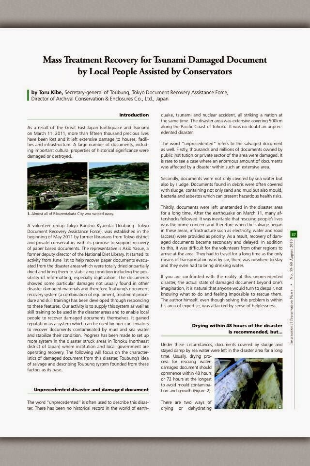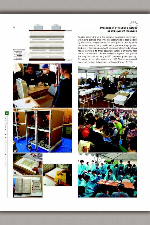 この中で東京文書救援隊事務局長の木部が Mass Treatment Recovery for Tsunami Damaged Document by Local People Assisted by Conservators 「津波で被災した文書の大量処置を、現地の人々にコンサバターがアシスト」として、東文救の活動を報告しています。
